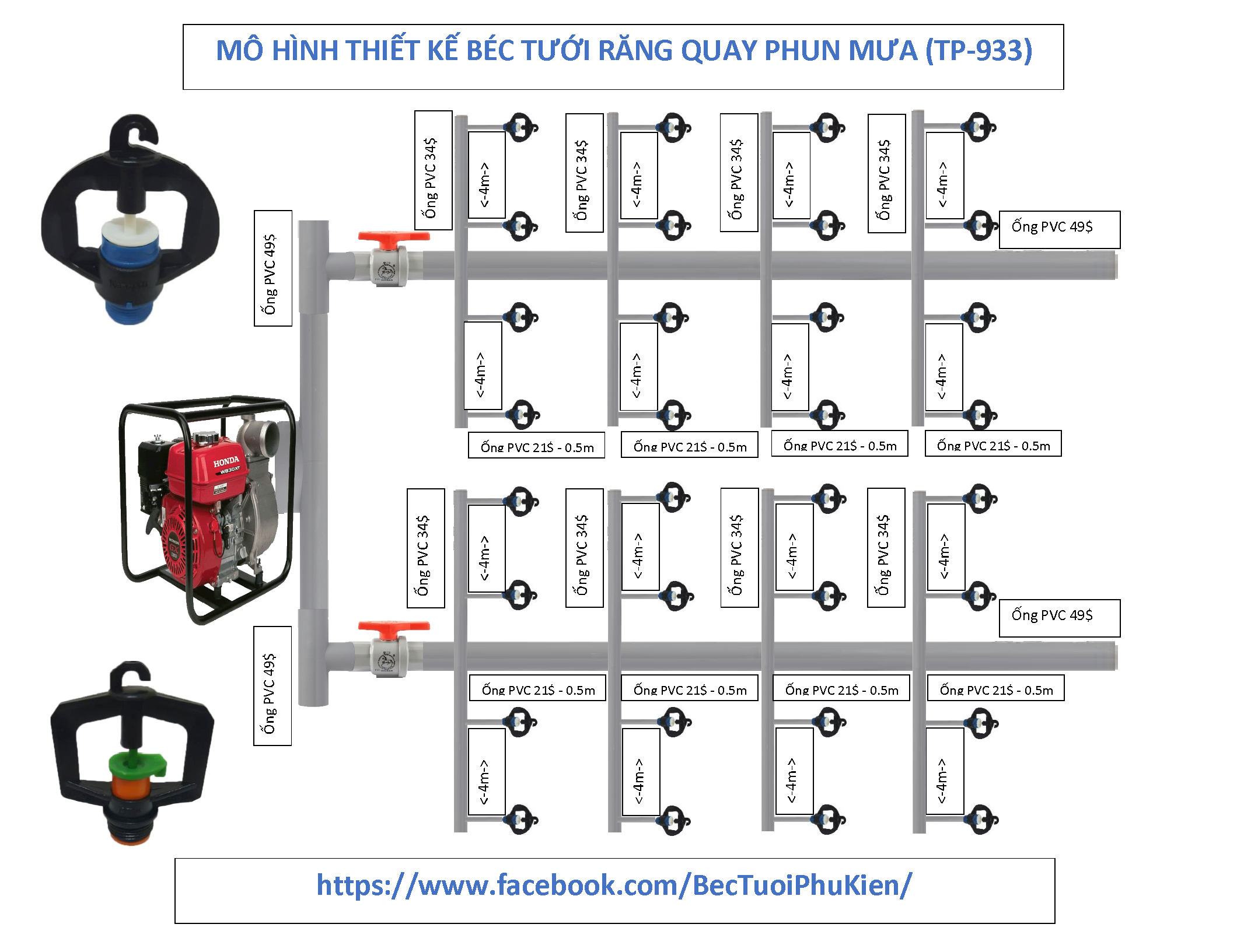 • Cách lắp đặt hệ thống tưới phun mưa cho diện tích trồng rau 1000m2 (ngang 20m, dài 50m).